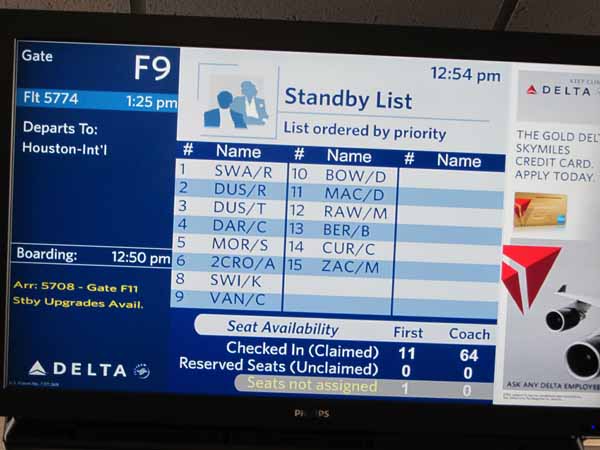 I arrived at the gate at about 12:25 and was told I was now at the top of the list for standby and the sign above me confirmed that fact.